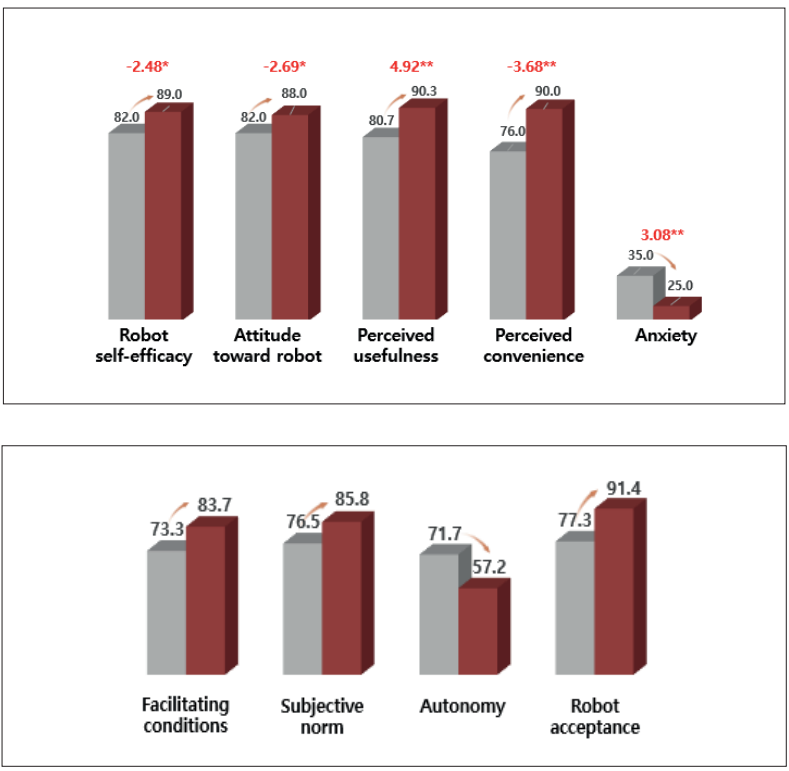 庆熙大学示范研究显示,10名65岁以上老年人使用4周后,抑郁评分从4.6分降至2.7分,HRV指数、自主神经系统活动等指标改善;定性访谈表明,机器人通过对话、问候功能缓解孤独抑郁,提供心理亲密感。心理效能评估显示,用户对机器人的自我效能感、接受度显著提升,焦虑情绪降低了72.6%,该机器人可作为非药物干预工具,用于改善社会隔离老年人的心理状态。