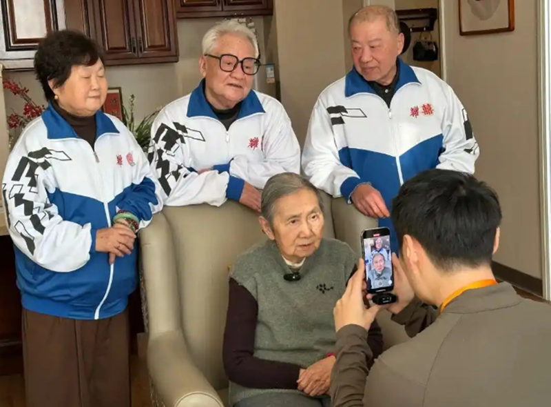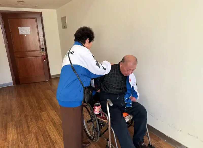 “拍视频去啊,余老师?按了18楼了,可爱看你们视频啦!”电梯里,两位年轻的护理员热情地和余老师打招呼。