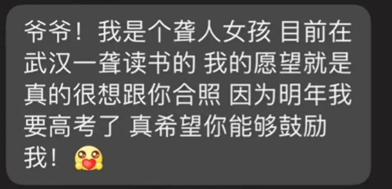 一次,老人收到一位听障女孩的私信,希望在高考前能和他拍一张照片。这位女孩的愿望深深打动了他,决定帮她实现这个心愿。后来,他和孙子康康去了女孩所在的特殊学校,为女孩高考加油。