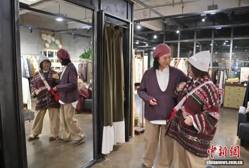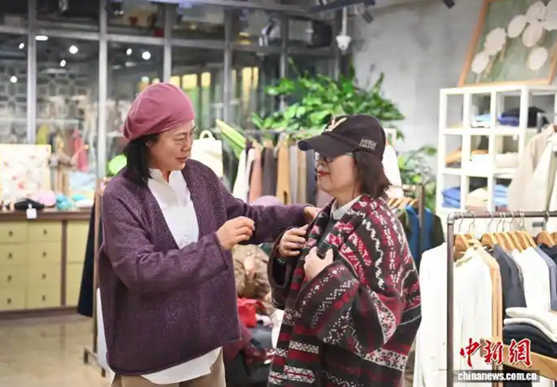11月24日,吉林长春,六旬穿搭博主张红霞(左)在为顾客搭配服装。中新社记者 张瑶 摄