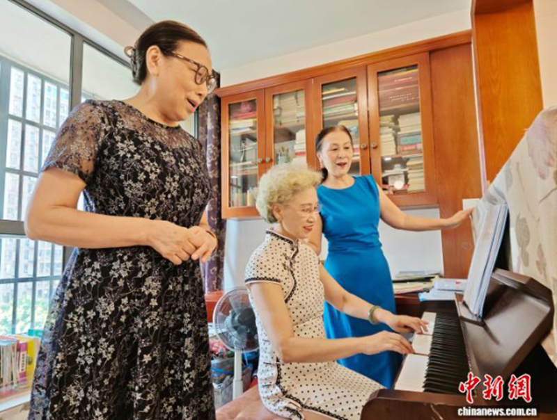 近日,湖南长沙,67岁的曹萍(中)和姐妹们在家弹钢琴。中新社记者 唐小晴 摄