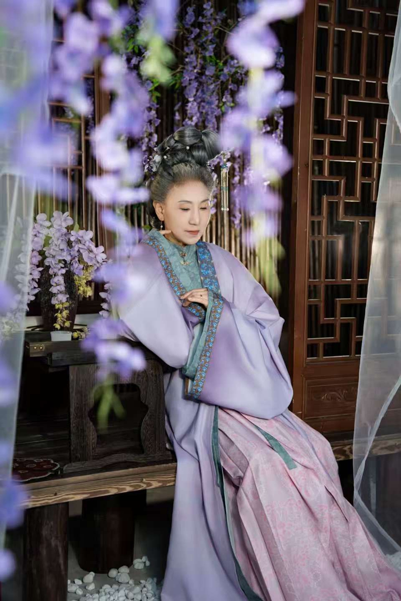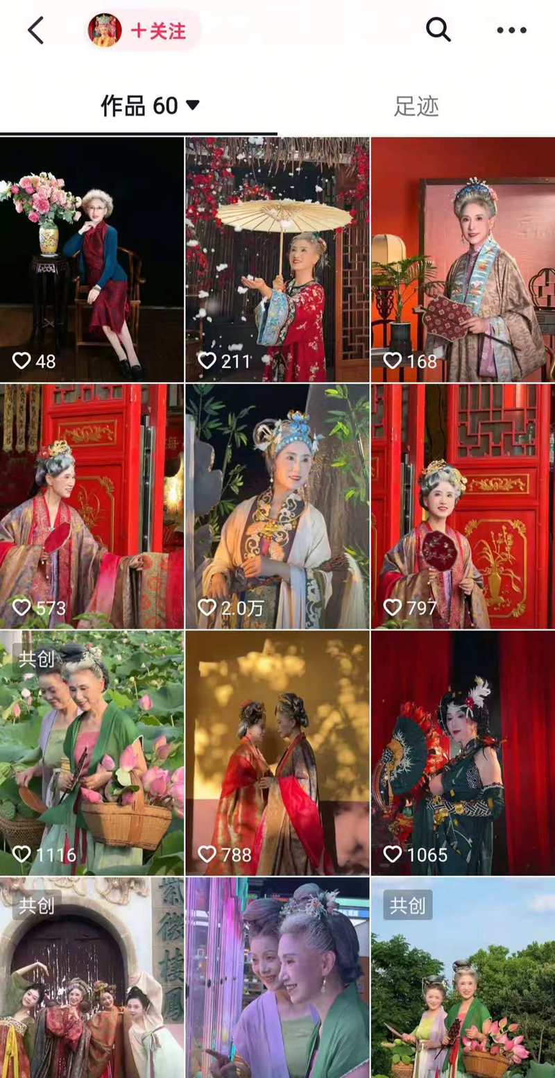今年67岁的曹萍是土生土长的长沙人,如今她拥有包括抖音在内多个账号,2023年至今已发布不少国风为主的短视频,有的流量过千万。如今,她的身份清单越来越长:汉服馆模特、广告代言人、景区宣传片演员……
