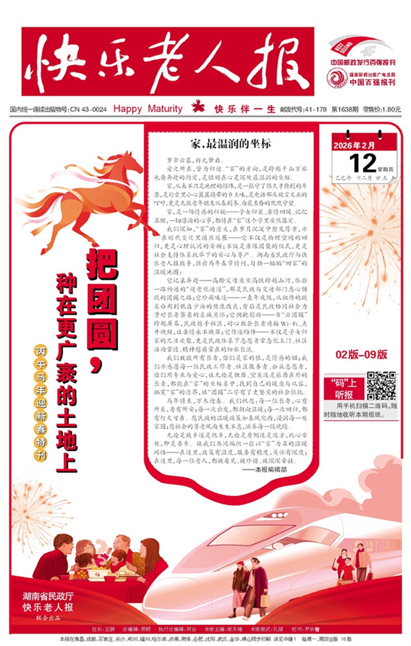 我们深知,“家”的意义,在岁月沉淀中愈发厚重,亦在时代变迁里悄然延展——它不仅是物理空间的回归,更是心理认同的安顿;不仅是亲缘团聚的仪式,更是社会支持体系托举下的安心与尊严。湖南省民政厅与快乐老人报携手,推出马年春节特刊——“温暖回家路”,勾勒一幅幅“回家”的温暖地图: